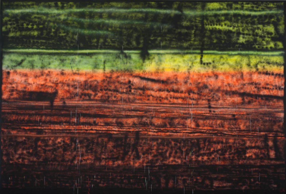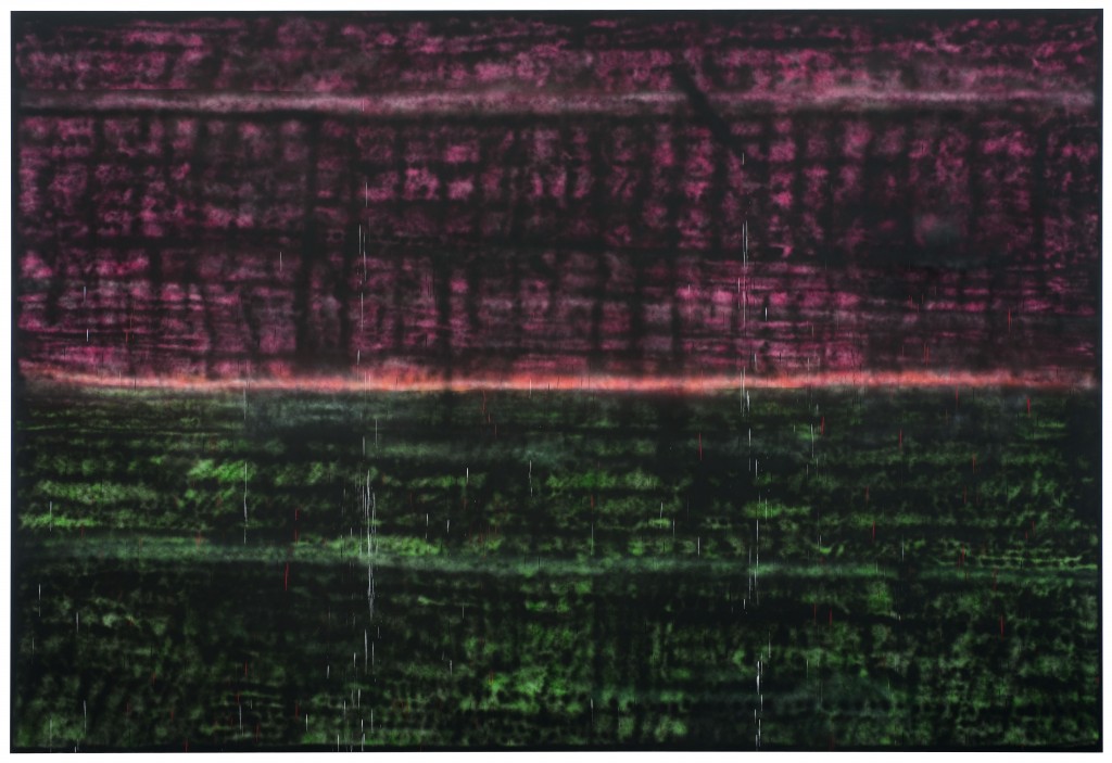 I quite liked the color tones in these two Sterling Ruby pieces, using pink and green tones as well as the divide in colors. I think that I’d like to create the horizon shape on my textile, because placed onto the circle will further create patterning on the body. The depth of textures is also really engaging in these pieces––the way the spray paint is applied creates different surface qualities and textures.